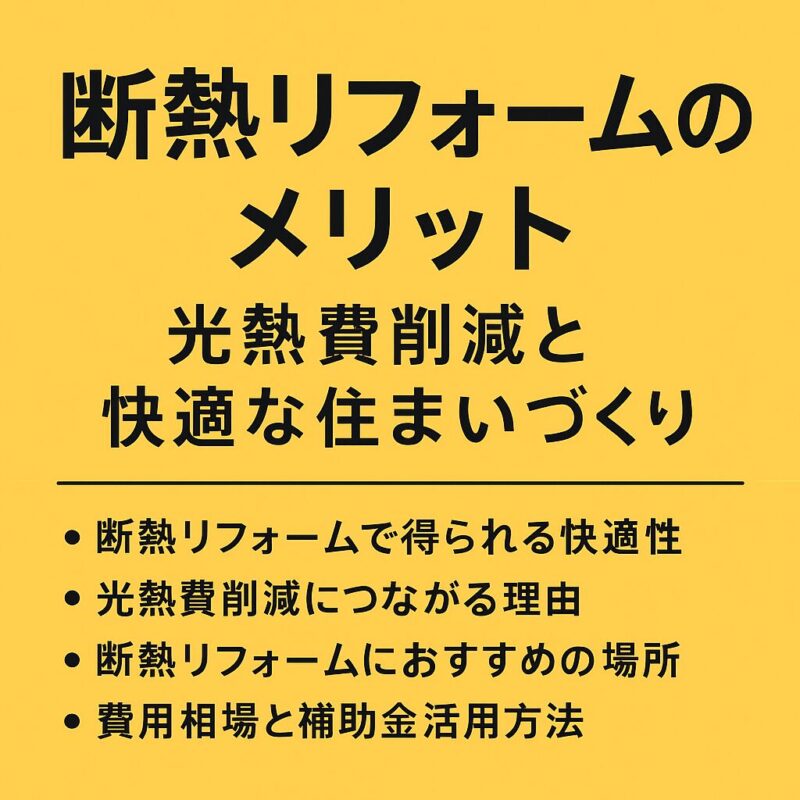 日々の暮らしに直結する体感改善が得られるため、断熱は「見えないリフォーム」でありながら、満足度が高い投資です。